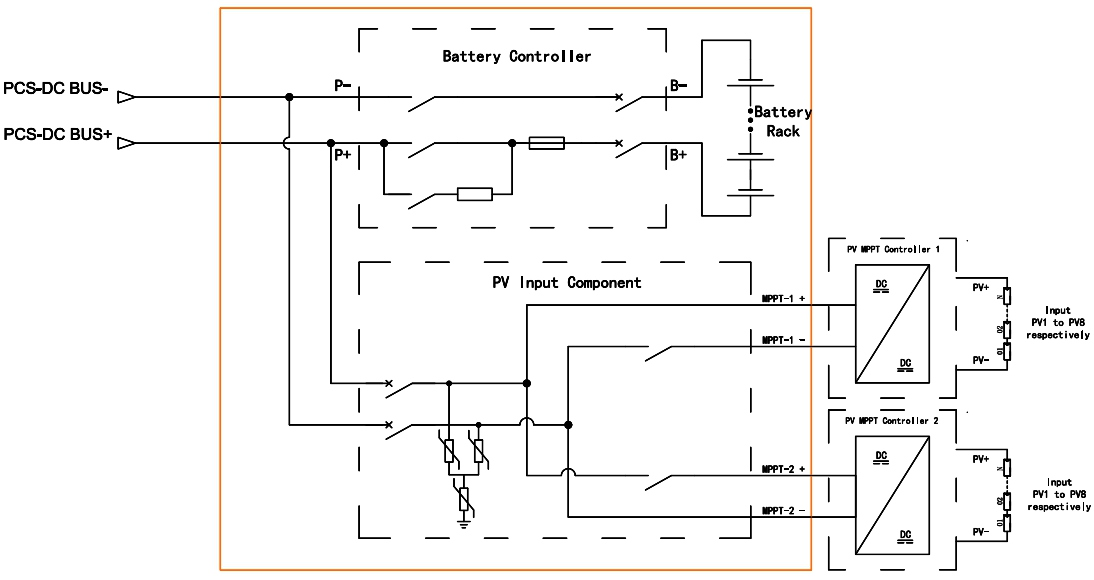 4. بیٹری انرجی اسٹوریج سسٹم میں بیٹری چارجنگ کی حفاظت کے لئے فوٹو وولٹائک ایم پی پی ٹی کو خود بخود کنٹرول کرنے کے لئے ایک یونیفائیڈ ڈی سی ان پٹ انٹرفیس اور بیٹری کنٹرول باکس شامل کیا گیا ہے۔